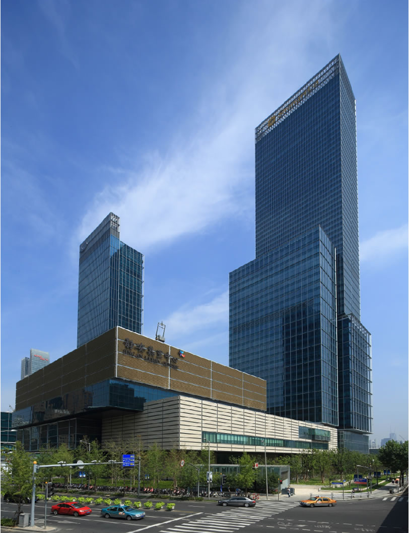 靜安嘉里中心地處繁華的南京西路商圈,嘉里中心聳立在上海市黃金地段,以優(yōu)越的位置和新穎的設計概念,迎合商界翹楚在商務和居住的要求。此項目結構高度244.8米,鋼結構用量約20,000噸,為帶伸臂桁架的(混合)框筒結構體系。